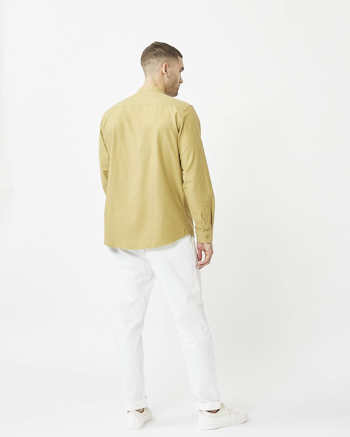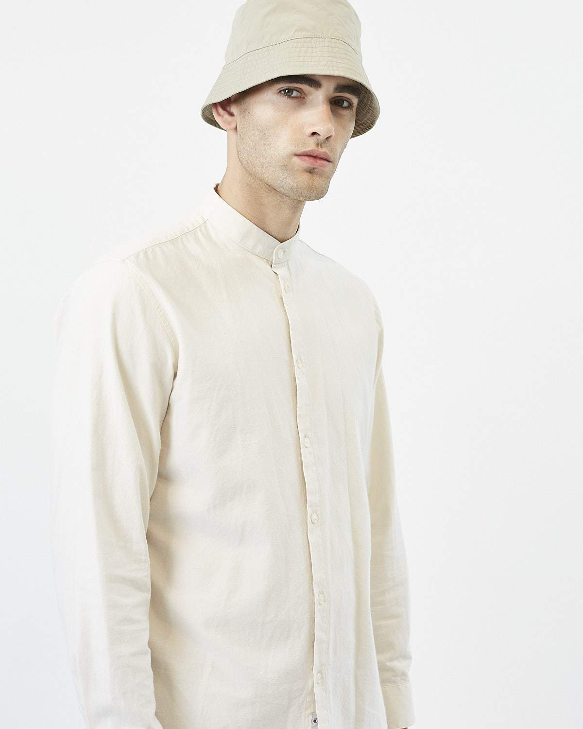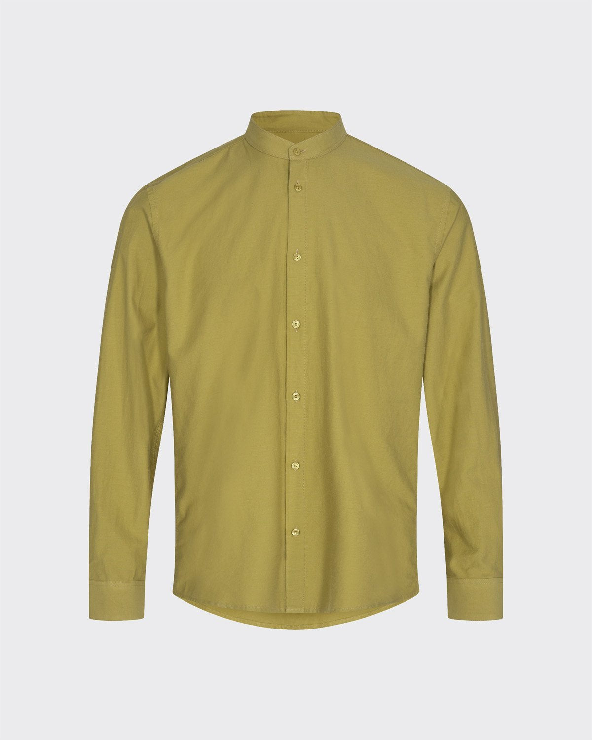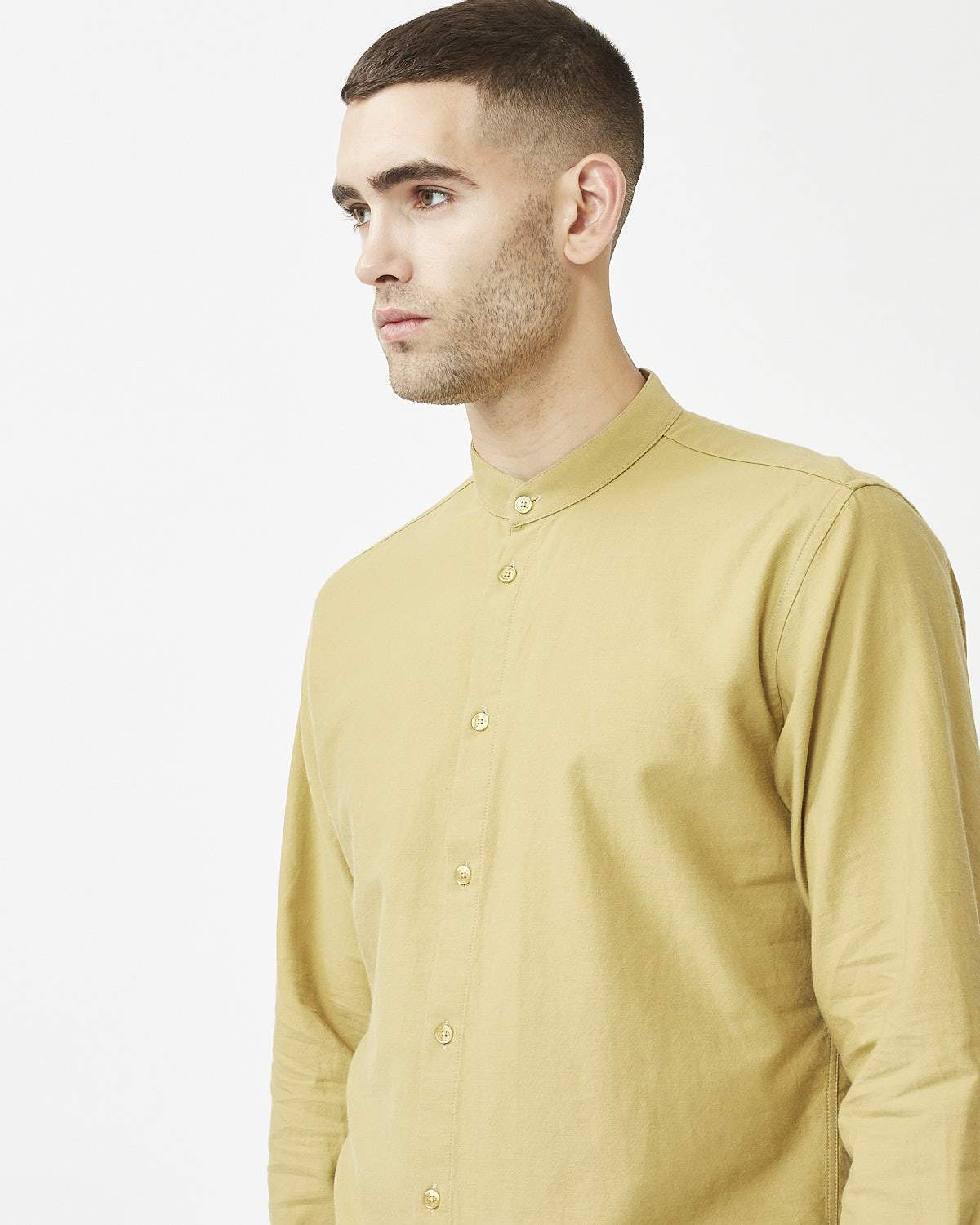 The shirt has a regular and relaxed fit and features front buttons, mandarin colar and buttoned cuffs.