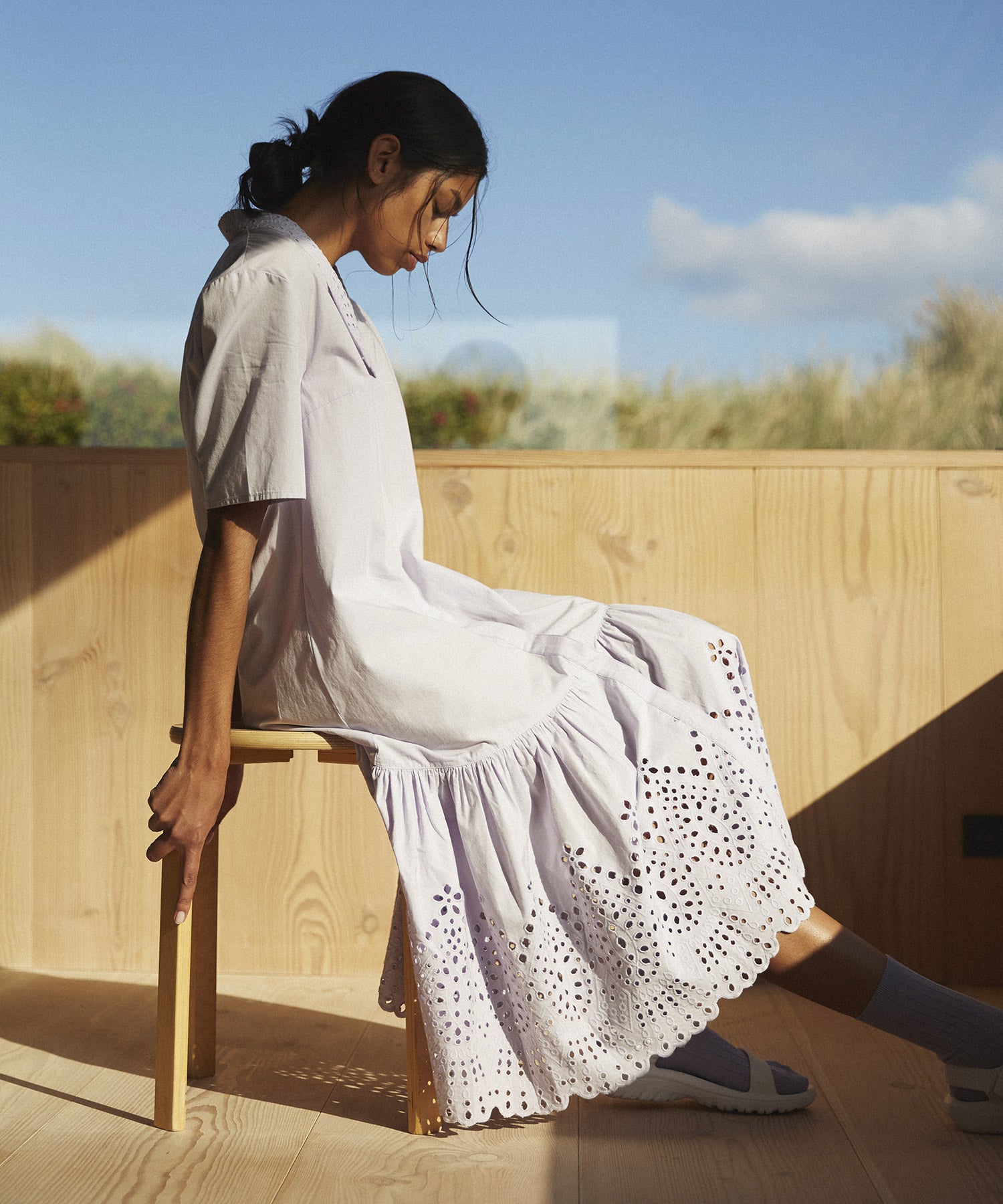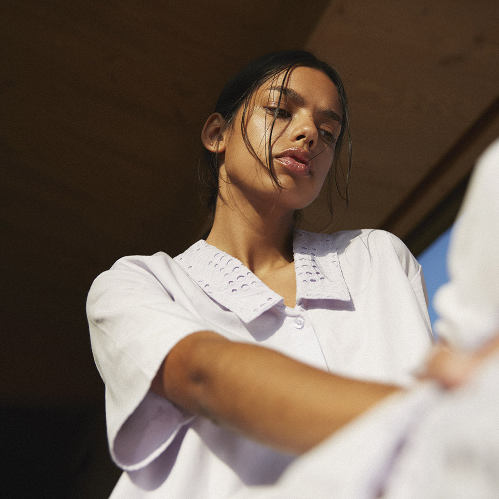 Achieve instant grace with the Aubreya dress, designed with a pointy shirt collar and a beautiful broderies anglaise bottom skirt. All crafted from crisp organic cotton.