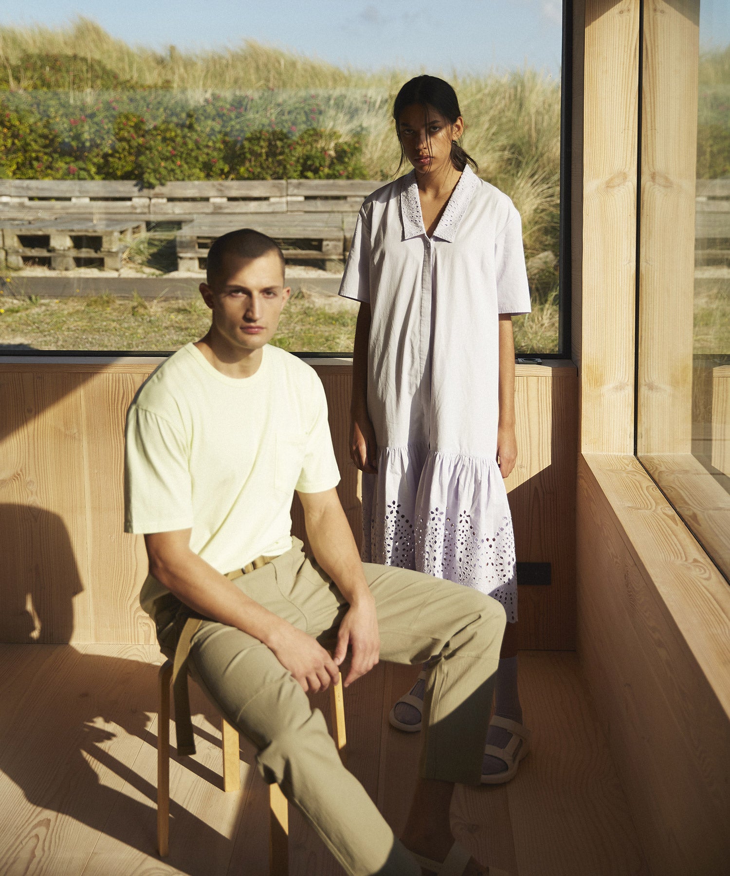 The dress is mindfully crafted from organic cotton, for a sustainable choice. It has a loose, straight fit and a seam at the bottom with pleats. It features v-neck, lace collar and closes at the front with hidden buttons.