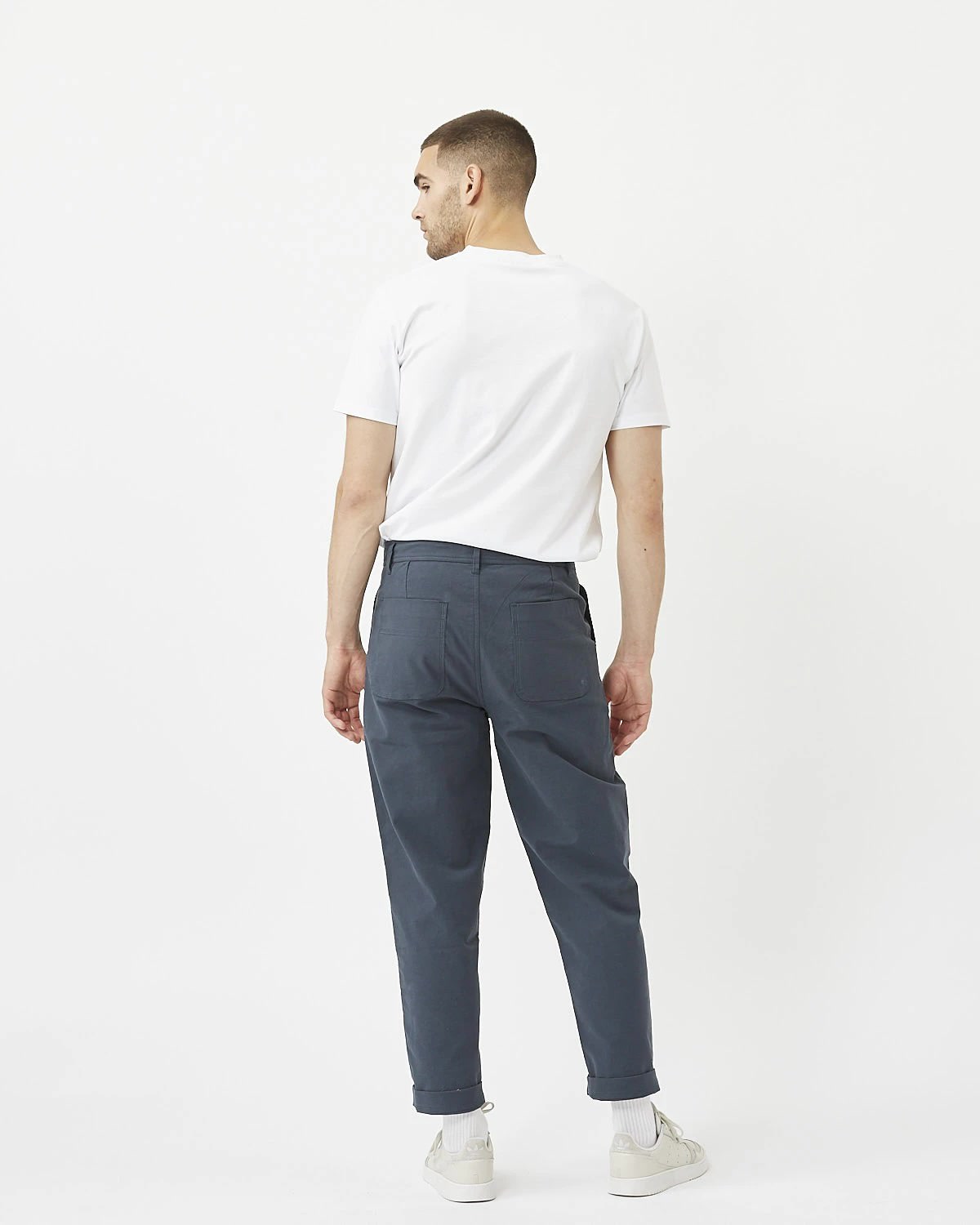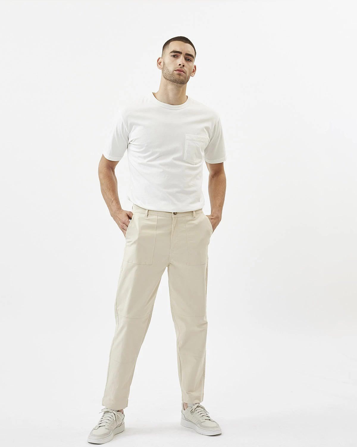 The pant has a regular fit and is constructed with tapered legs. It features two deep side pockets, two pockets on the back and closes with a hidden zipper and a button.