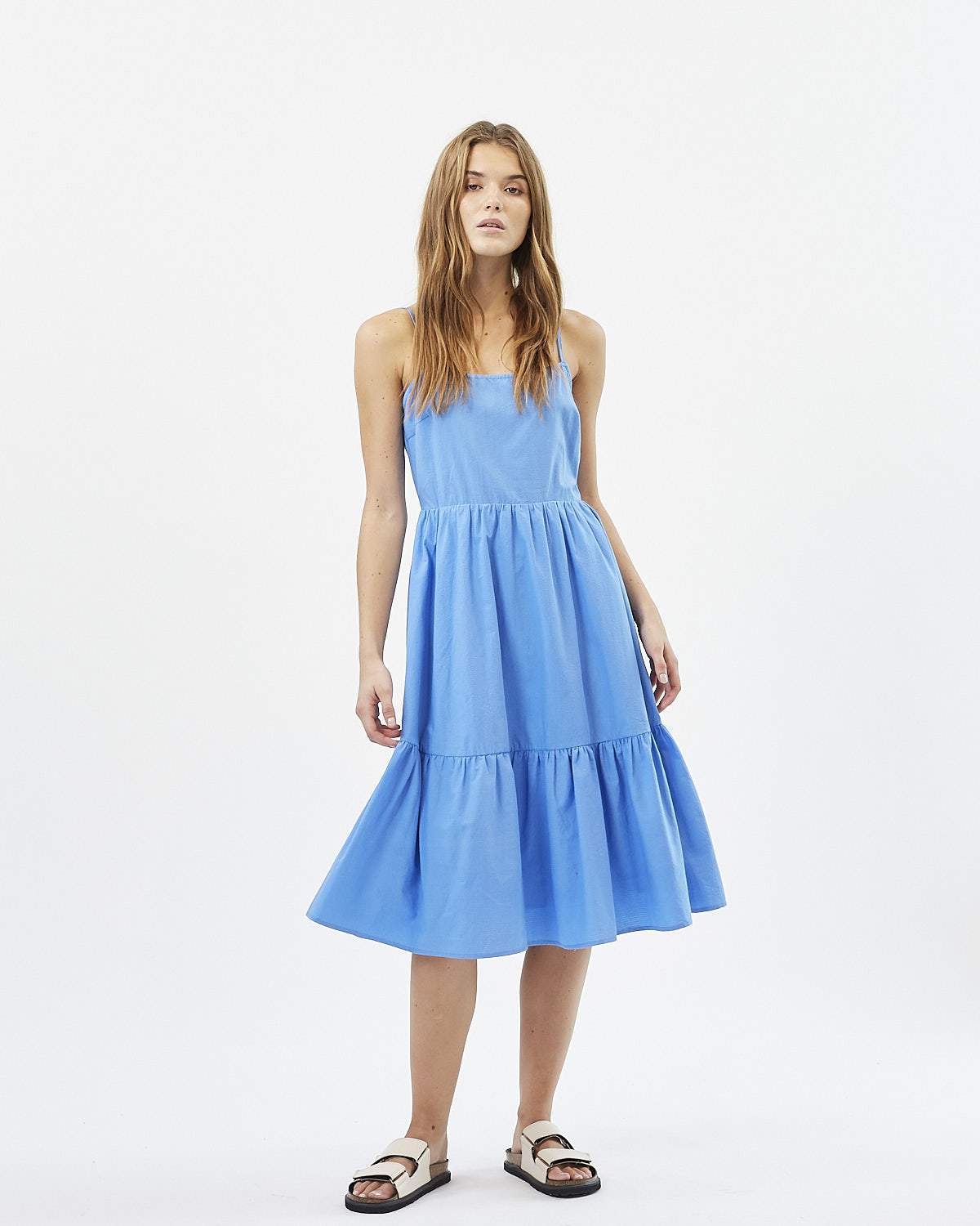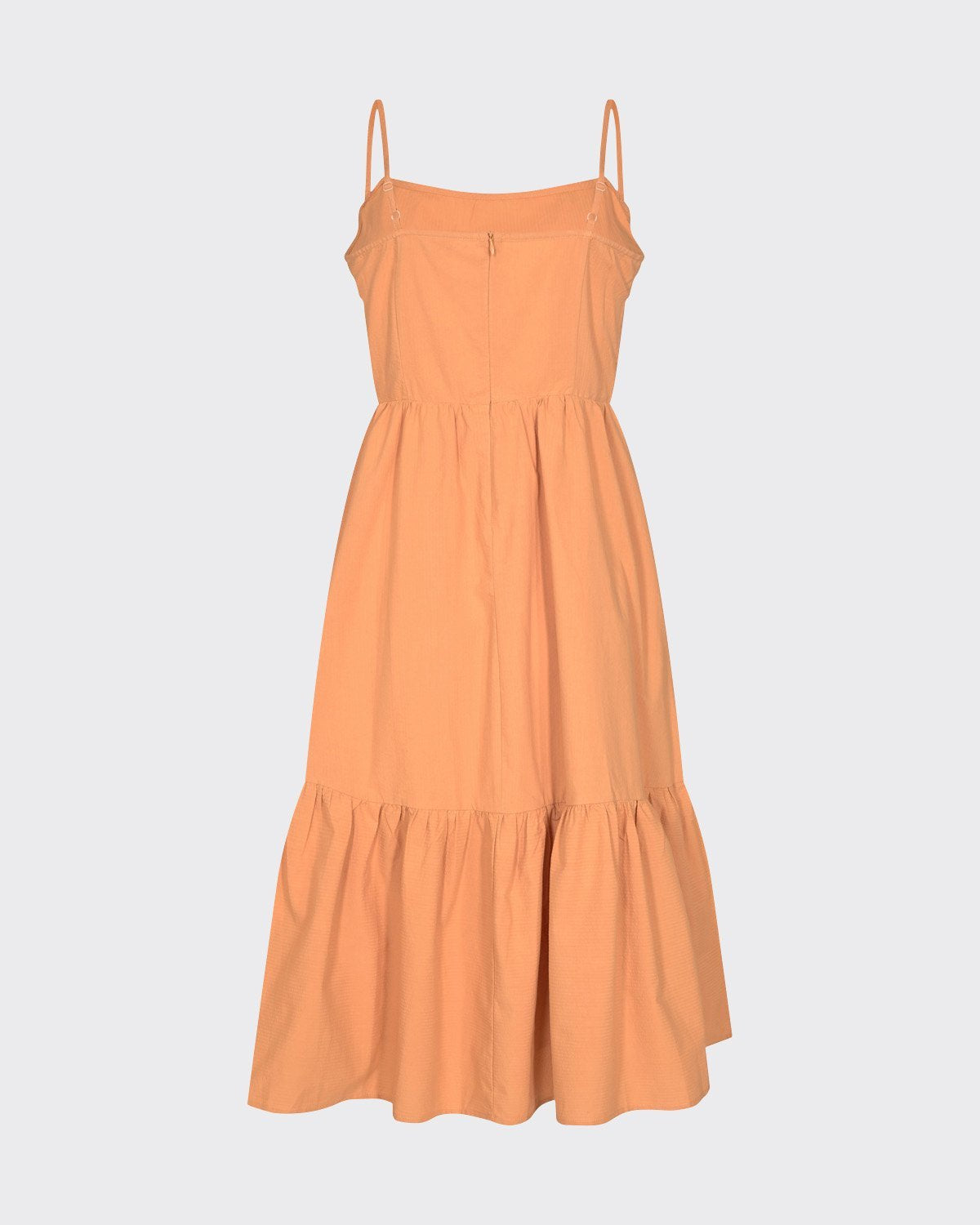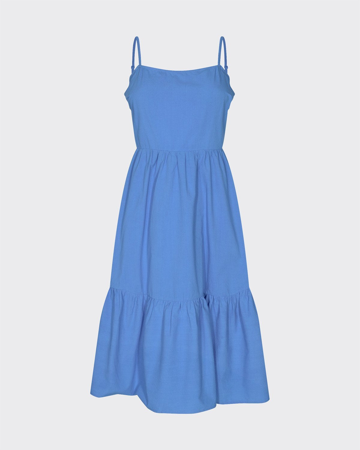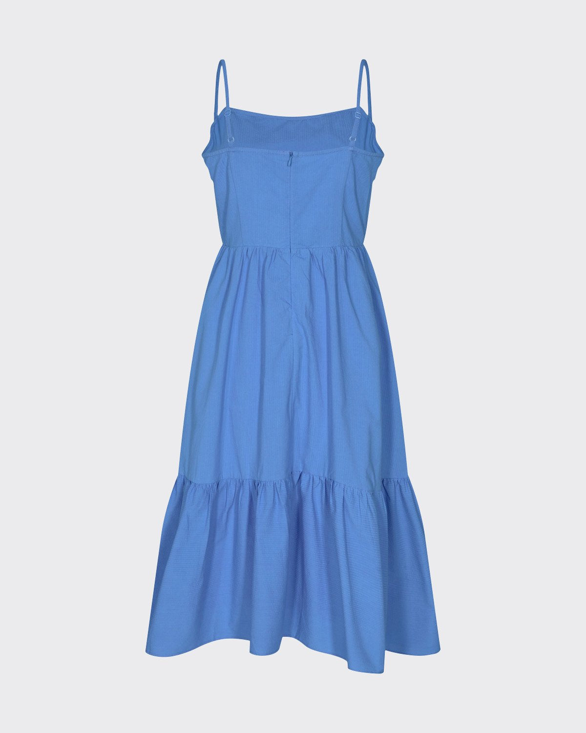 The dress is crafted from a slightly structured cotton quality and features straight neckline and pleated seams.