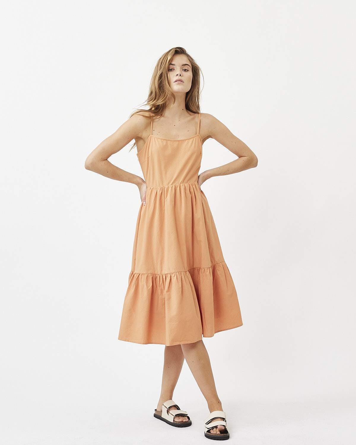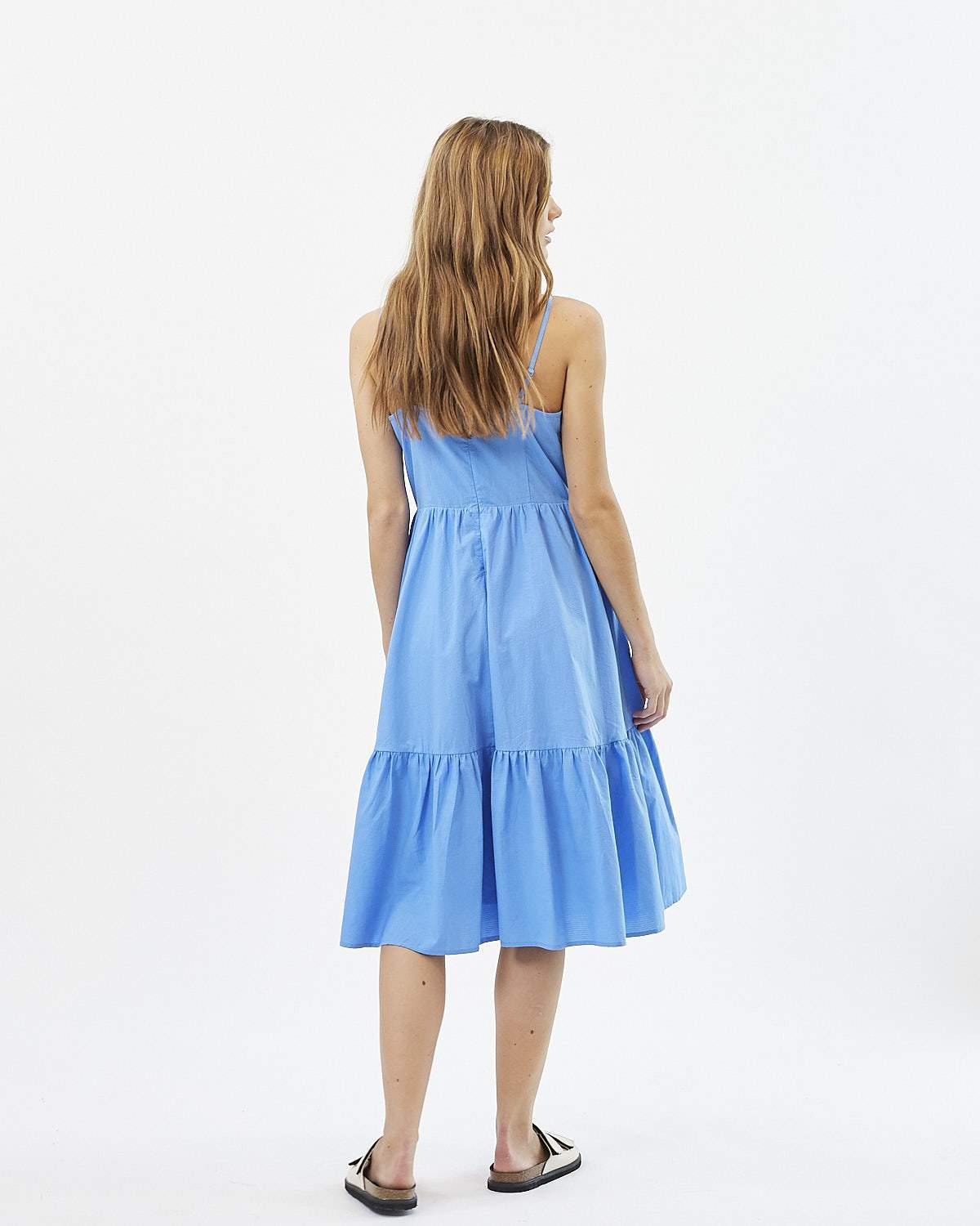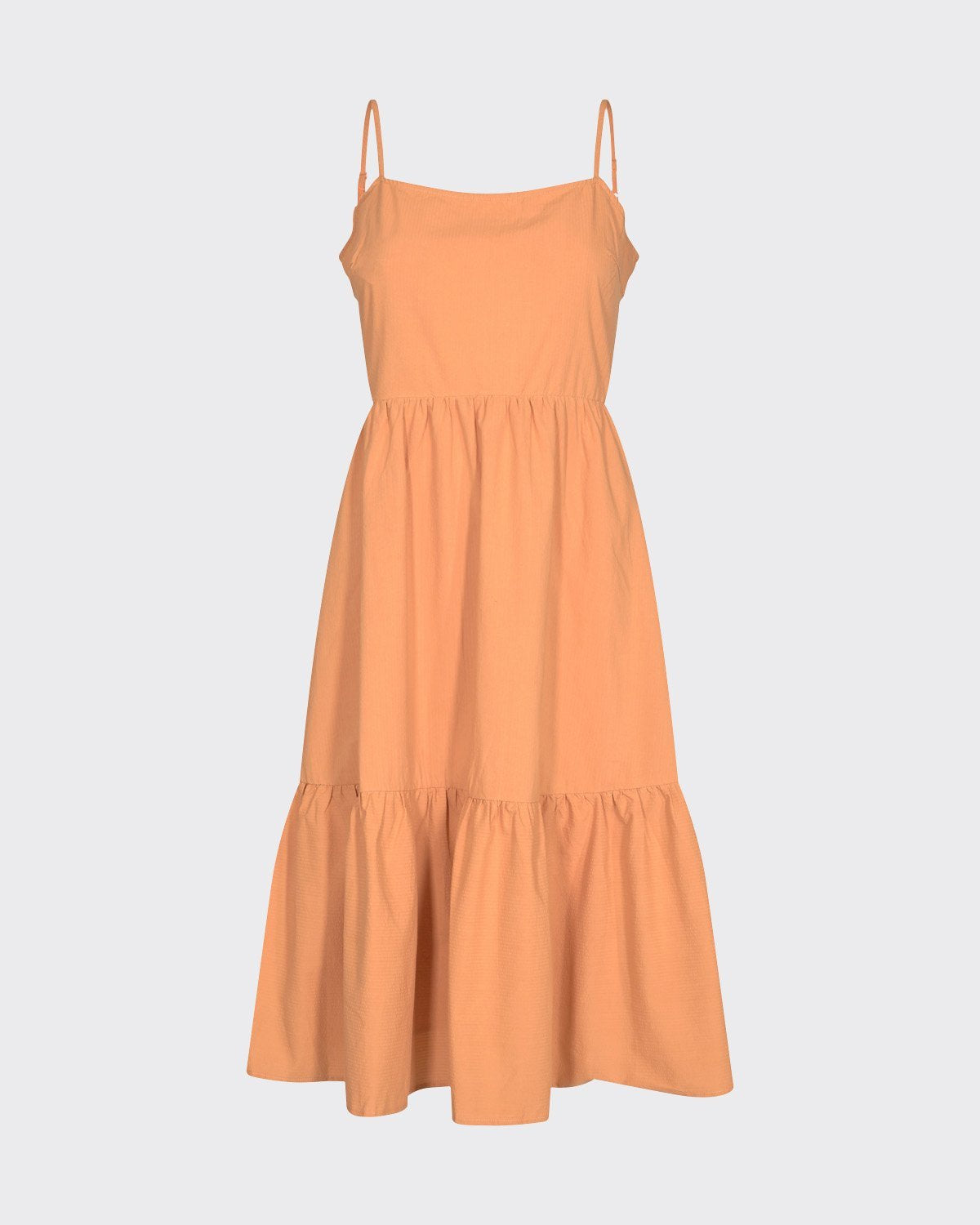 The dress is crafted from a slightly structured cotton quality and features straight neckline and pleated seams.