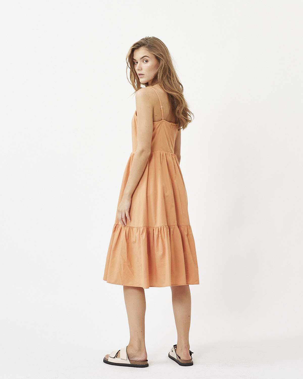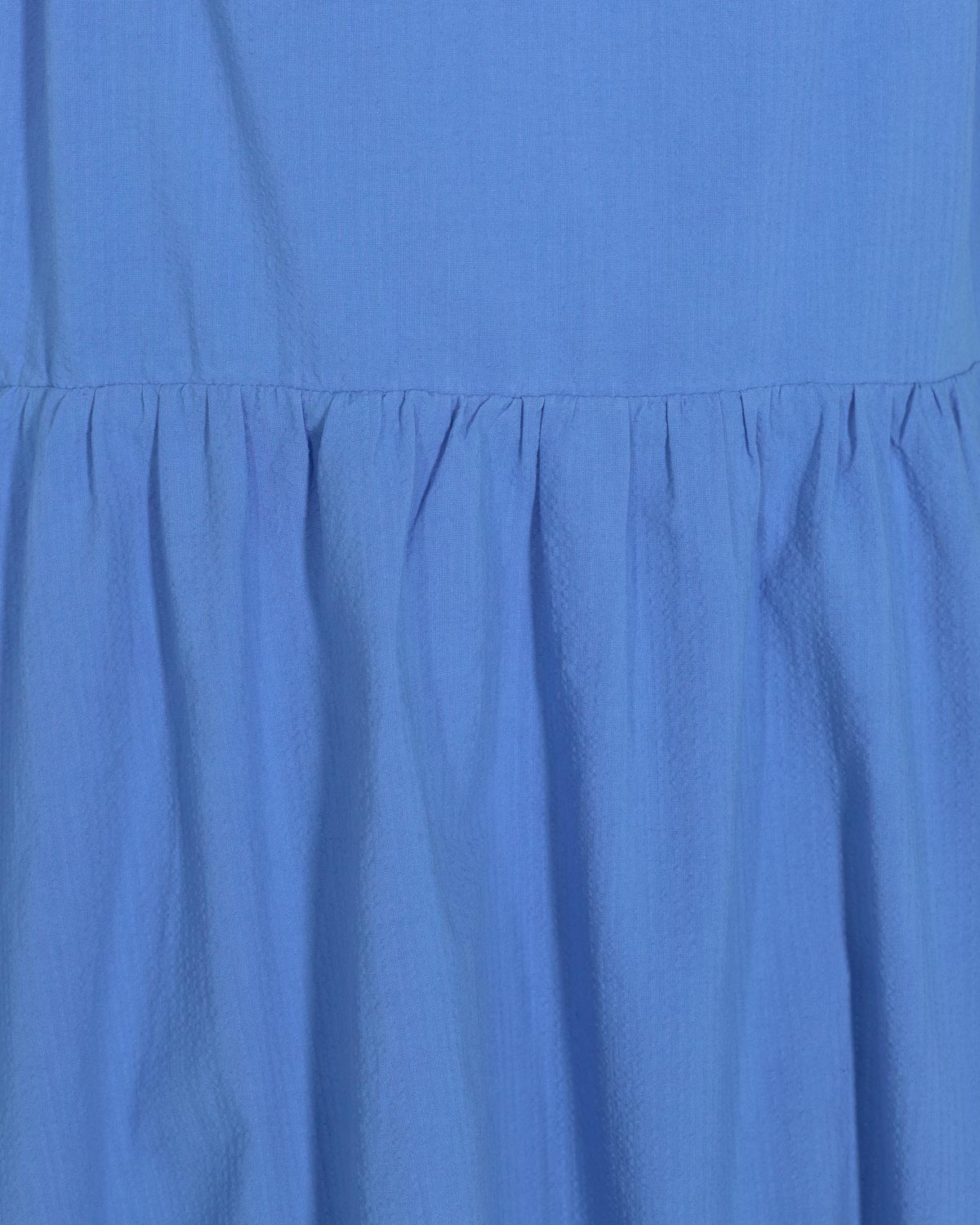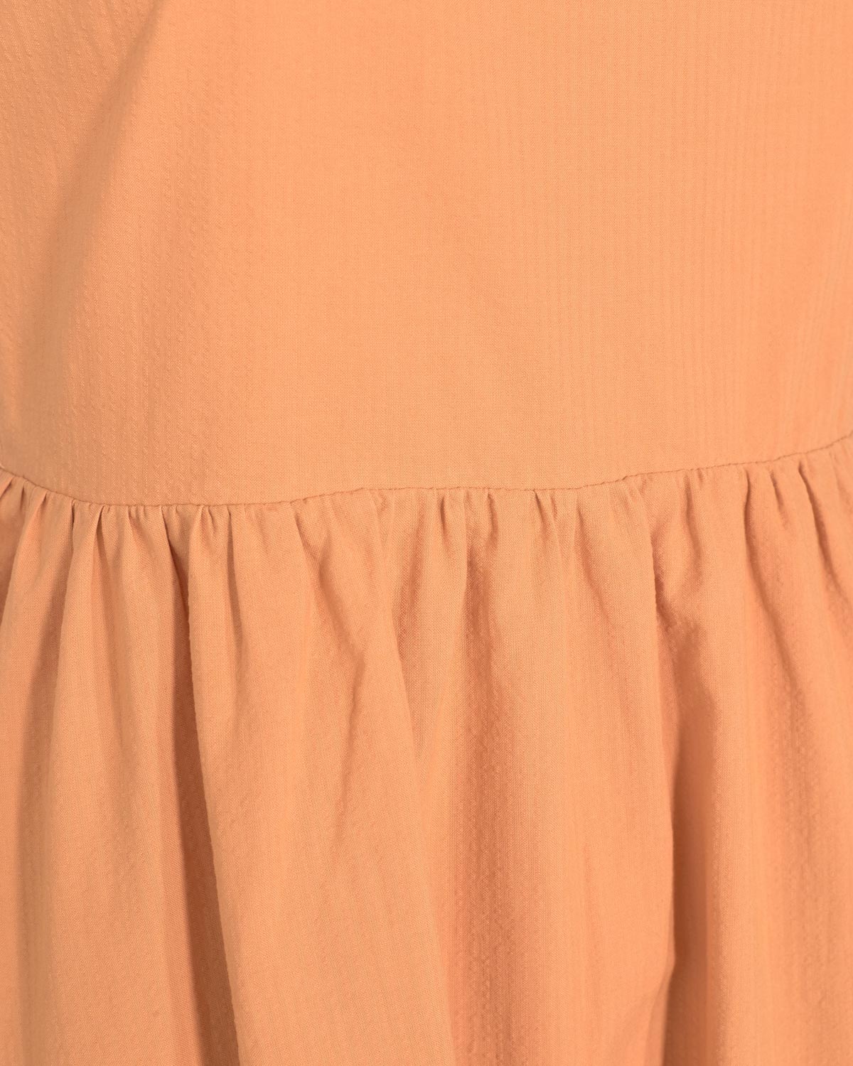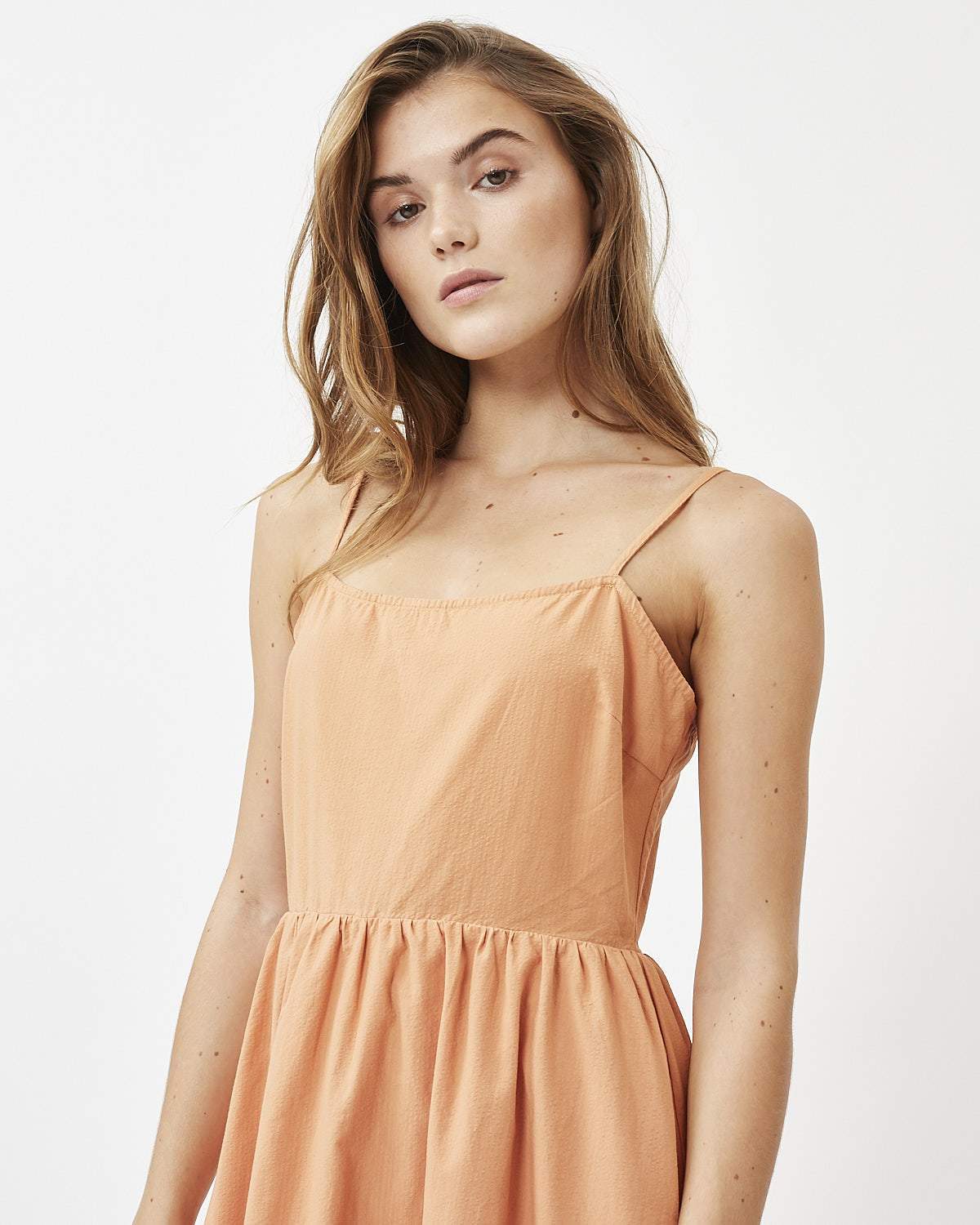 The dress is crafted from a slightly structured cotton quality and features straight neckline and pleated seams.