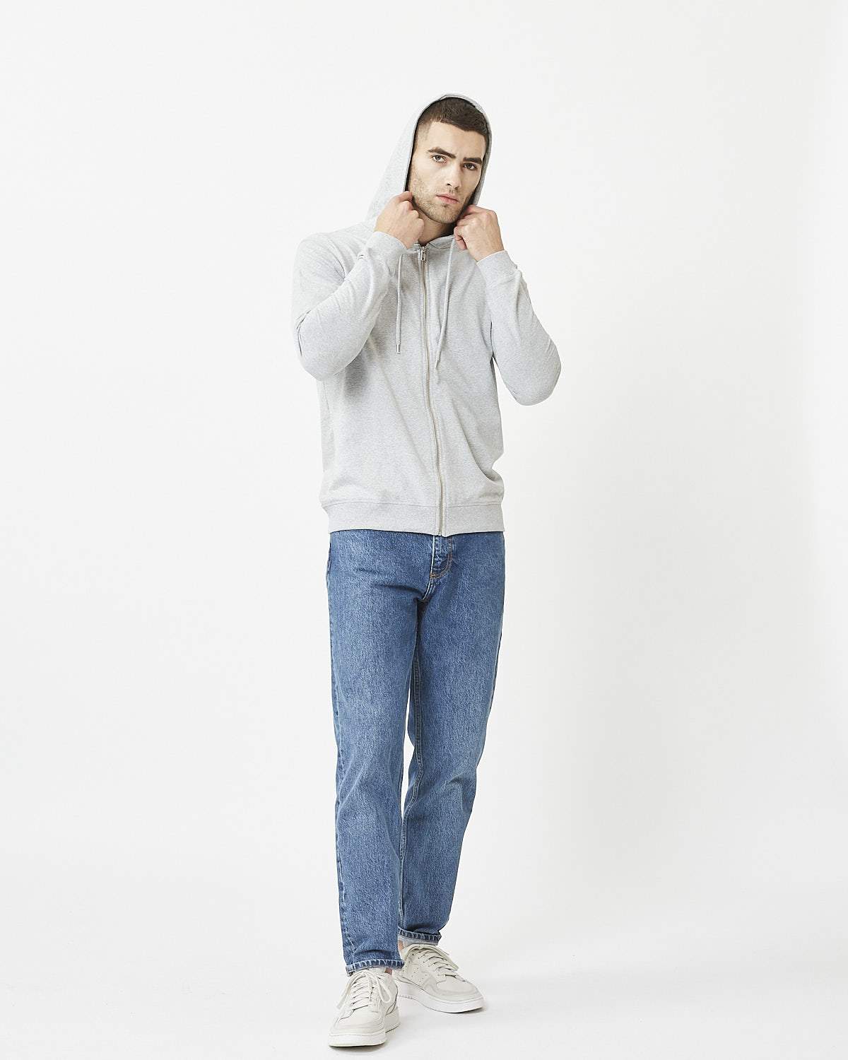 recycled cotton and polyester, for at sustainable choice. It has a regular fit and a relaxed cut. it features a drawstring hood, metal zipper and a clean, minimalistic front. The hoodie has a soft surface feel and a casual look.
