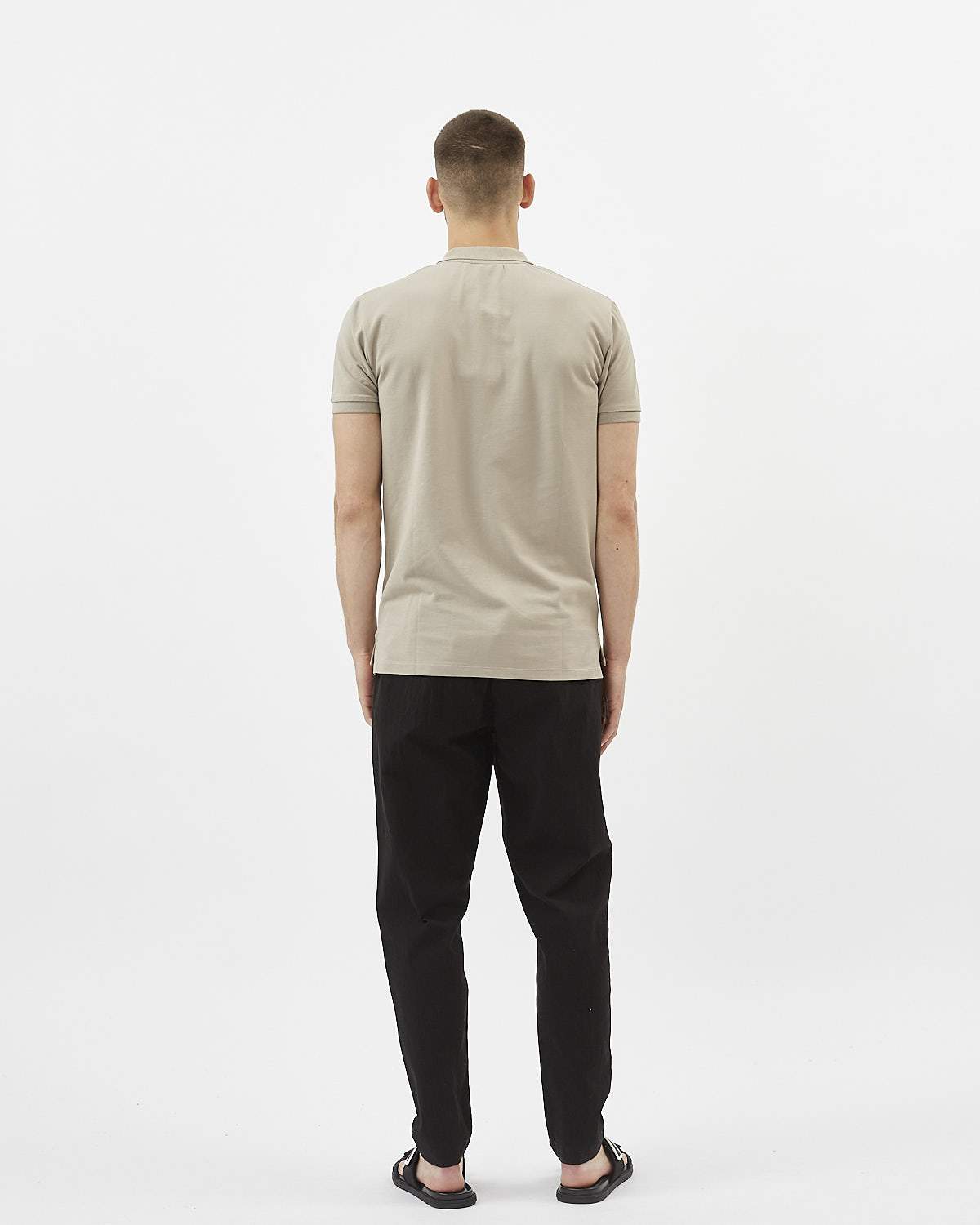 It is cut from a piqué structured fabric and is slightly fitted to the waist. The shirt features classic polo details such as a flat collar, short sleeves, a front plant with buttons, and stitched hems.