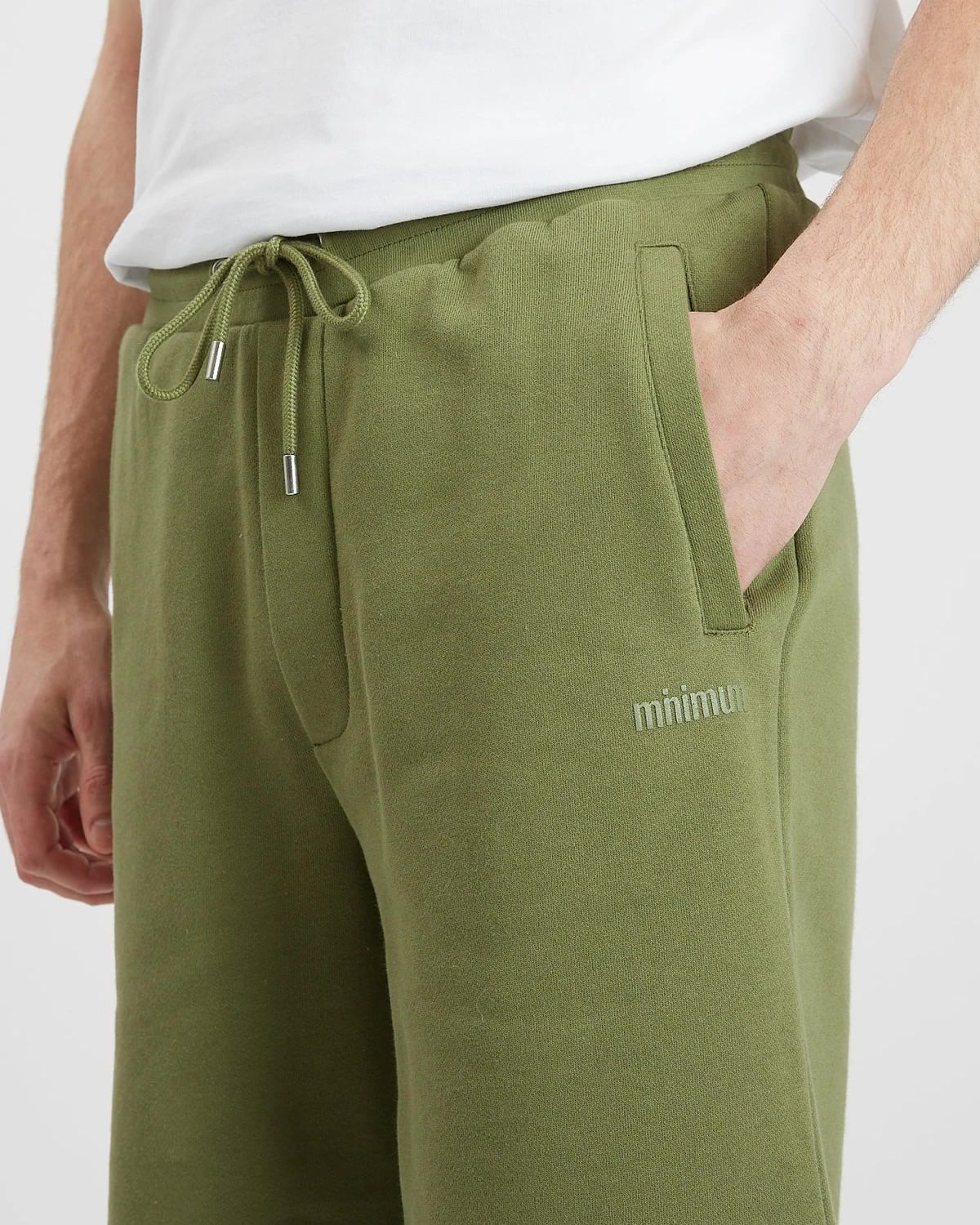 The shorts have an oversized fit and cuts above the knee. They feature an elastic waist with adjustable strings, two front pockets and a single pocket at the back. They are detailed with a tone on tone print with minimum' logo on the thigh.